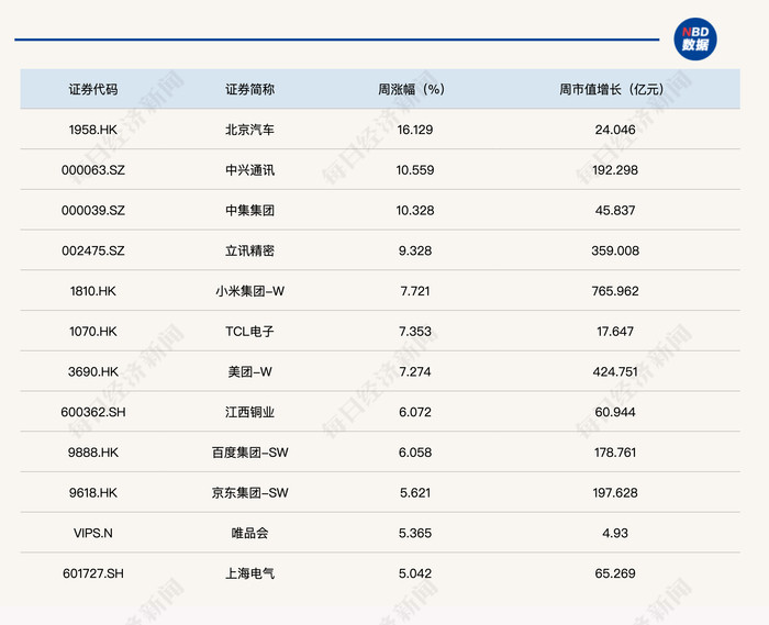成分股方面,北京汽车周涨16.13%,周涨幅最大;中兴通讯、中集集团的周涨幅均超过10%,表现抢眼;另外,立讯精密、小米集团-W、江西铜业以及唯品会等9只个股周涨幅也均超过5%。市值增长方面,小米集团-W和阿里巴巴-W的周市值增长均超过500亿元。